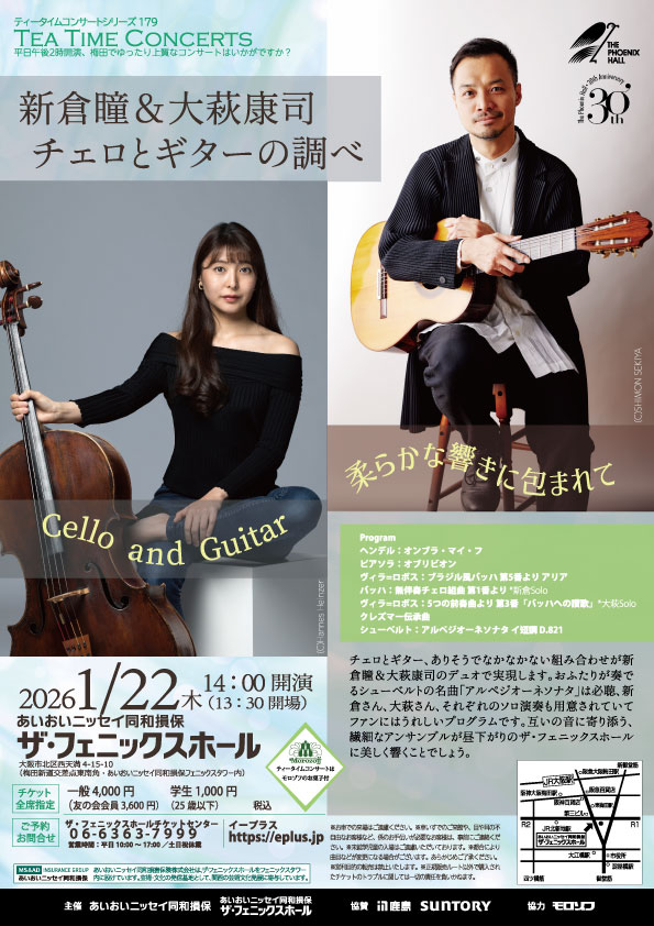 チェロとギター、ありそうでなかなかない組み合わせのコンサートです。新倉さん、大萩さん、それぞれがザ・フェニックスホールの主催公演で登場されたこともあるお馴染みの実力派。その二人が出会い協演する事で音楽の魅力が幾重にも膨らみます。今回はシューベルトのアルペジョーネソナタ、ヘンデルのオンブラ・マイ・フ等、クラシック音楽の名曲をお届けします。少し変わった楽器の組み合わせで聴く名曲は、これまでと違った楽しみができると思います。二人が奏でる柔らかな音の世界をお楽しみください。
