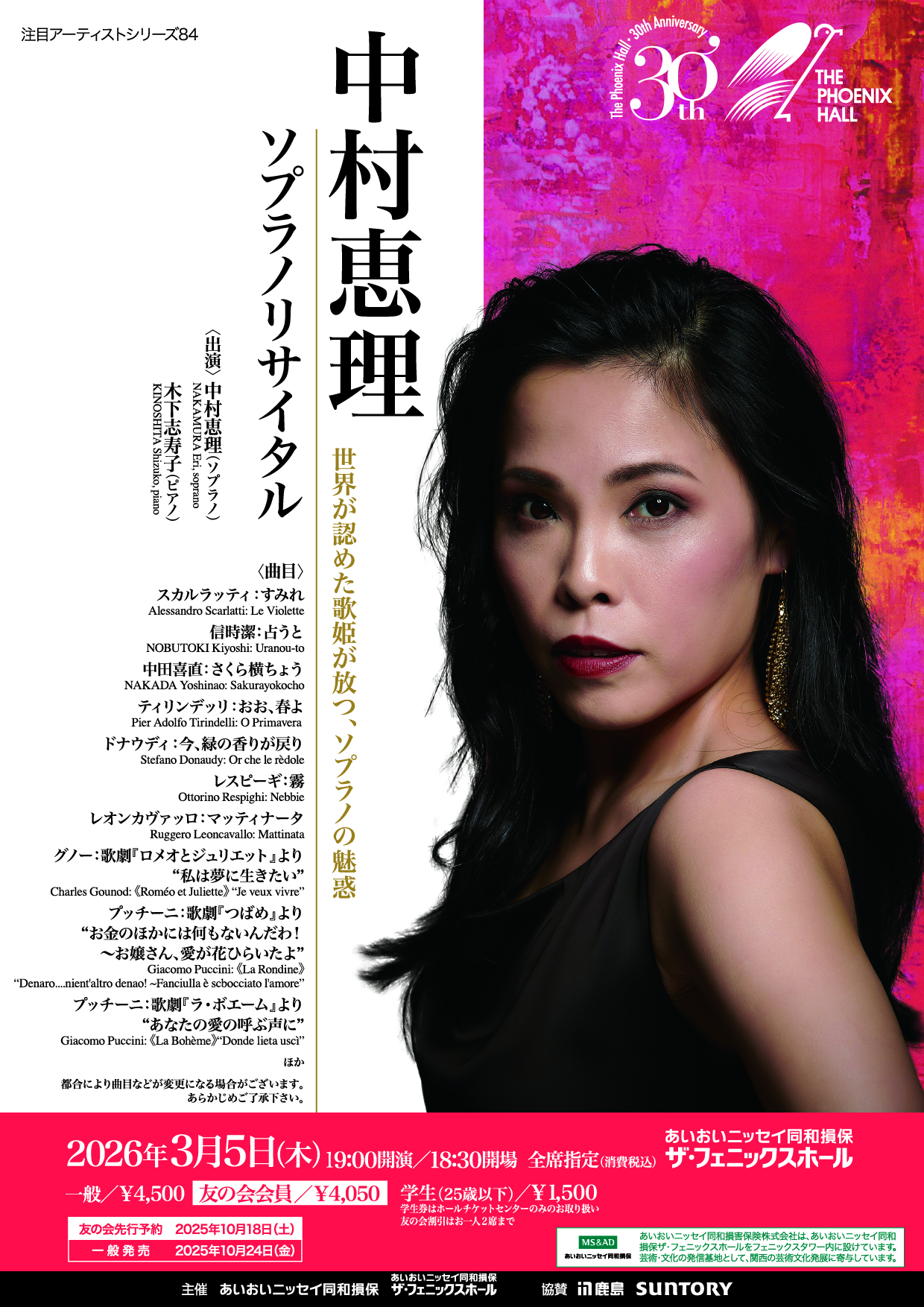 バイエルン国立歌劇場の専属歌手として活躍し、世界の一流オペラハウスでも注目を集めているソプラノ歌手・中村恵理さんが、いよいよザ・フェニックスホールに初登場!今回のプログラムでは、イタリア歌曲やオペラ・アリアの名曲を中心にお届けします。共演は、中村さんが全幅の信頼を寄せるピアニスト・木下志寿子さん。二人の息の合った演奏で生まれる音楽の世界にご期待ください。豊かな声量と磨き上げられた表現力 — 美しい歌声に酔いしれる、特別な夜をどうぞお聴き逃しなく!